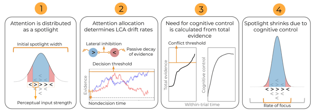 Growing evidence for moment-to-moment fluctuations in visual attention has led to questions about the impetus and time course of cognitive control. These questions are typically investigated with paradigms like the flanker task, which require participants to inhibit an automatic response before making a decision. Connectionist modeling work suggests that between-trial changes in attention result from fluctuations in conflict—as conflict occurs, attention needs to be upregulated to resolve it. Our work extends this intuition to the within-trial level, and propose that changes in cognitive control and attention are emergent properties of the dynamics of the decision itself. Combining a sequential sampling model framework with likelihood-free Bayesian approximation methods allows us to conduct quantified comparisons between subject-level fits, and identify the moment-to-moment influence of conflict resolution on within-trial evidence accumulation.